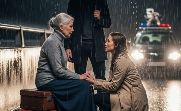 I turned sharply. A woman stood a few feet away, holding a small bouquet of white roses. She was soaked from the rain but didn’t seem bothered.